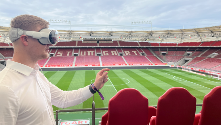 Ein besonderes immersives Erlebnis im Rahmen des „Innovation Matchday“ in der MHP Arena war die 360-Grad-Liveübertragung eines Bundesligaspiels auf Head-Mounted Displays (HMD). Der VfB Stuttgart, die DFL Deutsche Fußball Liga und das Tech-Start-up Softseed haben diesen Test – den ersten seiner Art bei einem Bundesligaspiel – gemeinsam entwickelt. Die Zuschauer konnten zwischen drei verschiedenen Kameraperspektiven wählen, die auf Apple Vision Pro Virtual-Reality-(VR)-Headsets von MHP bereitgestellt wurden. Mithilfe spezieller 360-Grad-Kameras, die im Stadion installiert waren, konnten sie beispielsweise den Blick von der Mittellinie genießen oder ihren Kopf drehen, um die Trainerbank und den technischen Bereich aus nächster Nähe zu sehen. Mit ausreichender Bandbreite könnte dieser Inhalt in Zukunft direkt über Glasfaserverbindungen in die Wohnzimmer der Fans übertragen werden.