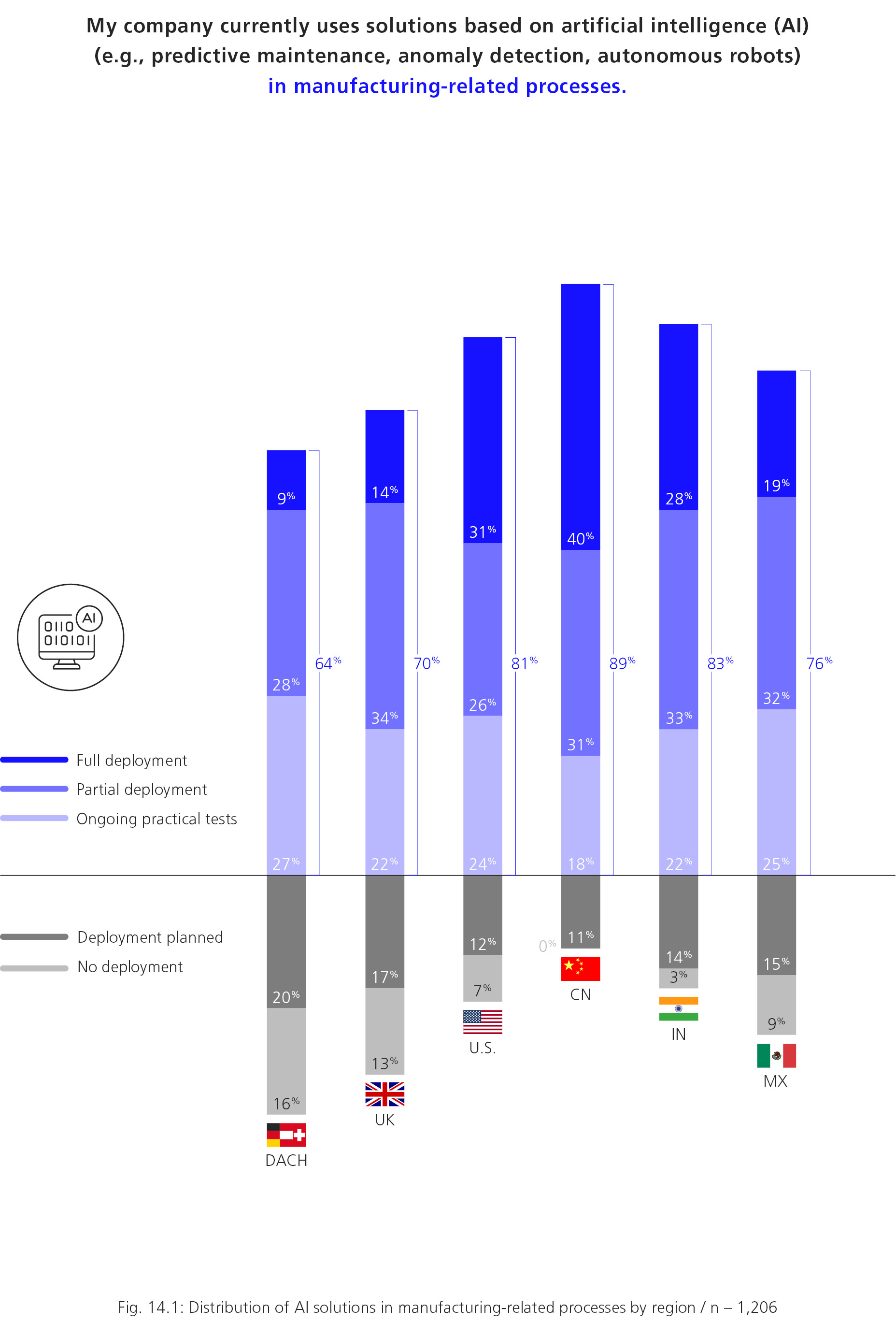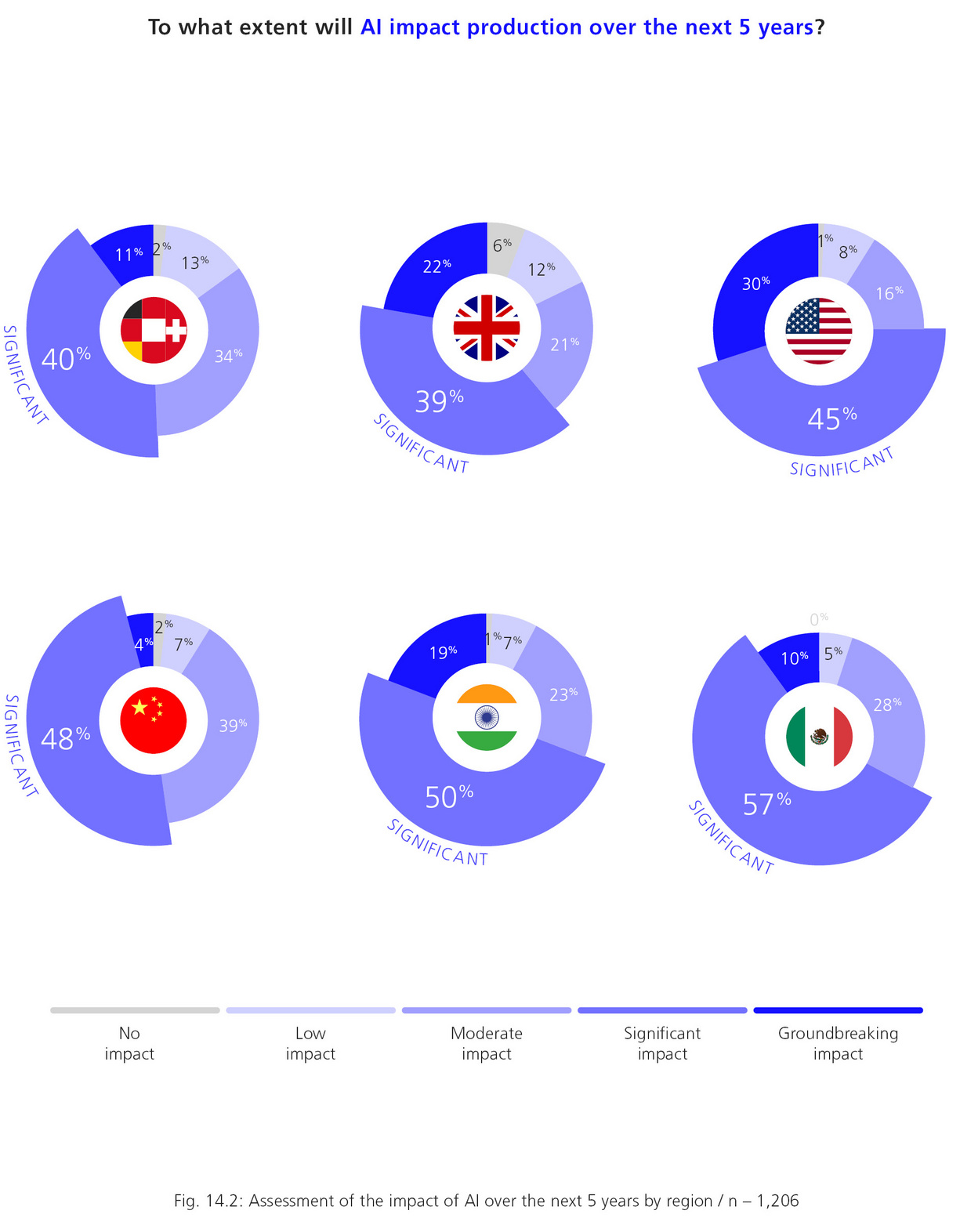 In contrast, there is broad consensus when it comes to expectations: 51 percent of DACH companies believe that AI will have “significant” or even “groundbreaking” effects on production over the next five years. China shows a similar level of agreement at 52 percent.